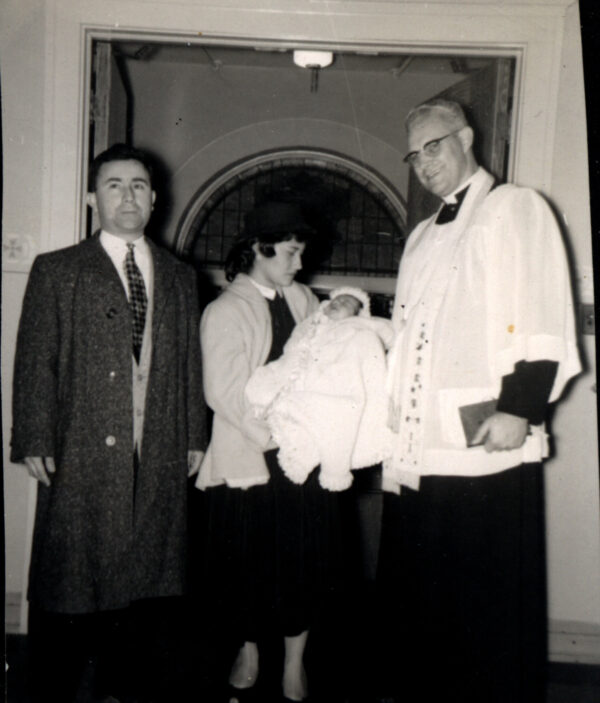 Thomas C. Lianez baptism. Joe Alvarado ( Godfather),Woman Unknown, Father Russel Gillig, Pastor, St. Mary’s Catholic Church, Van Wert. Ohio 1956