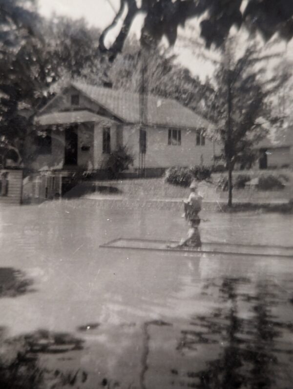 Outside of of our Vine Street home. The street would regularly flood and we could float down the street on rafts our dad made. Recalls Tom Lianez.